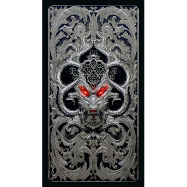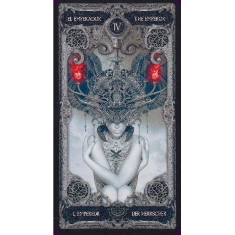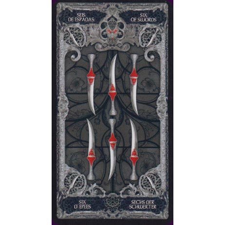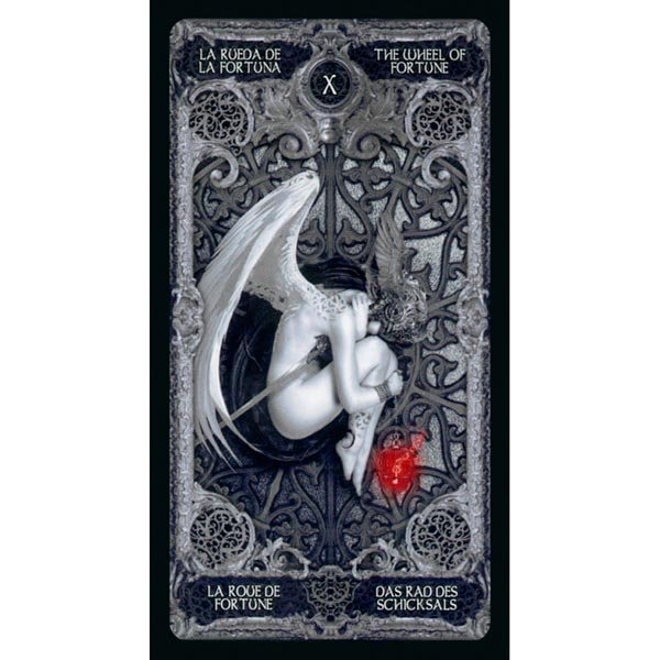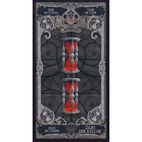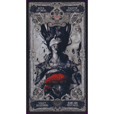 Este é literalmente um Tarô Dark, ilustrado em cinza e preto e com destaques em vermelho. É uma obra de arte no estilo gótico.